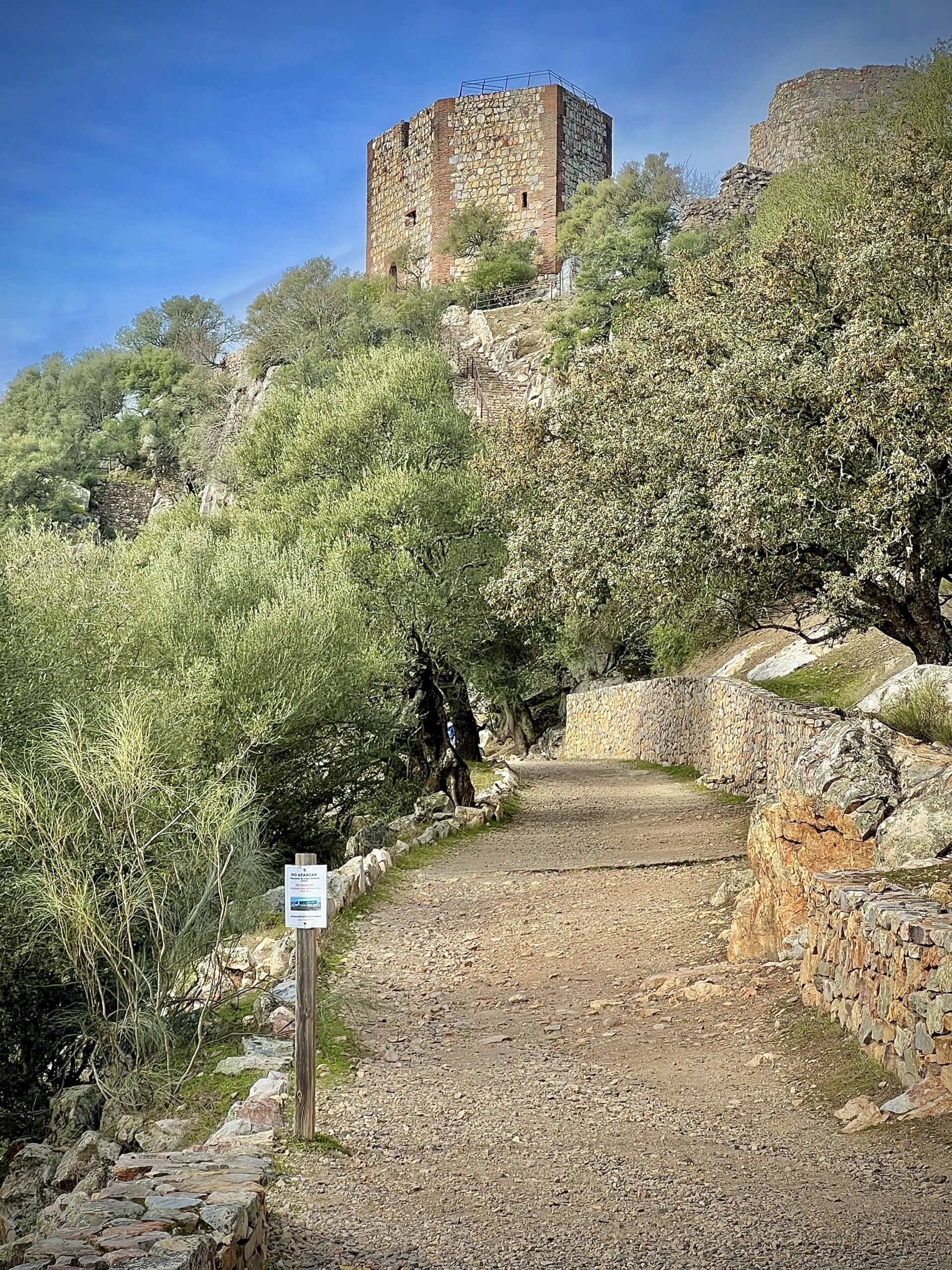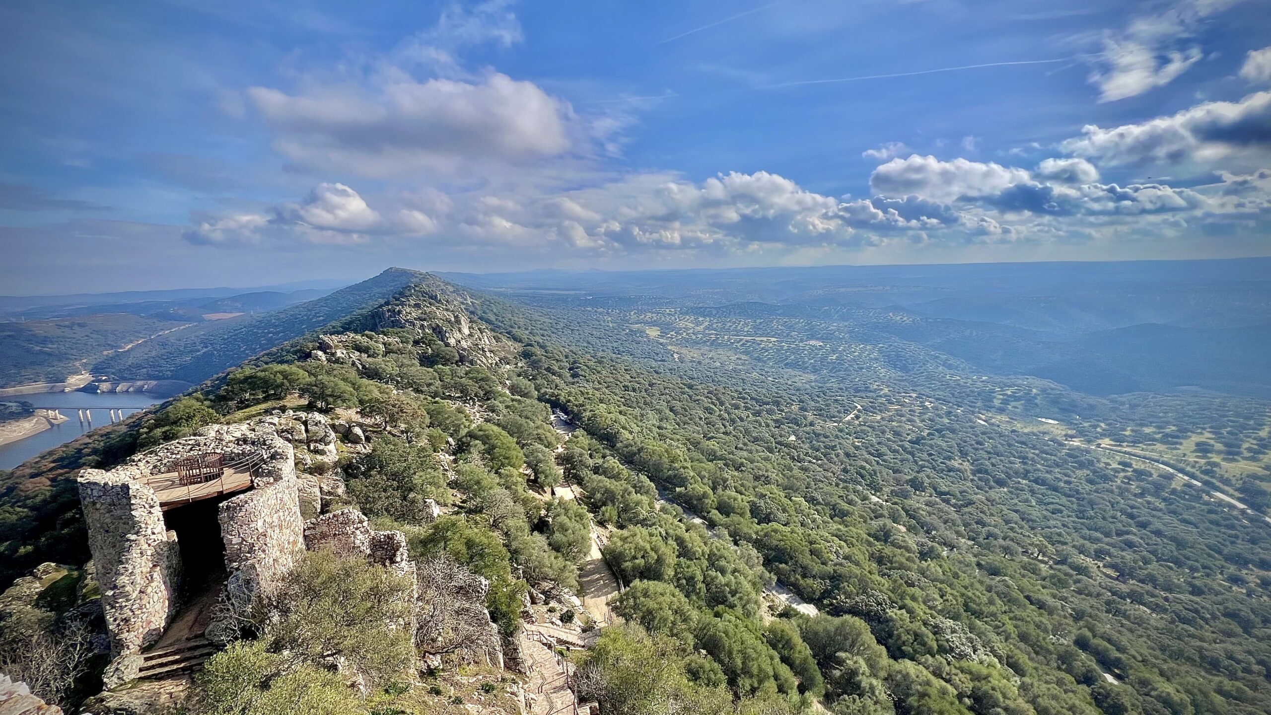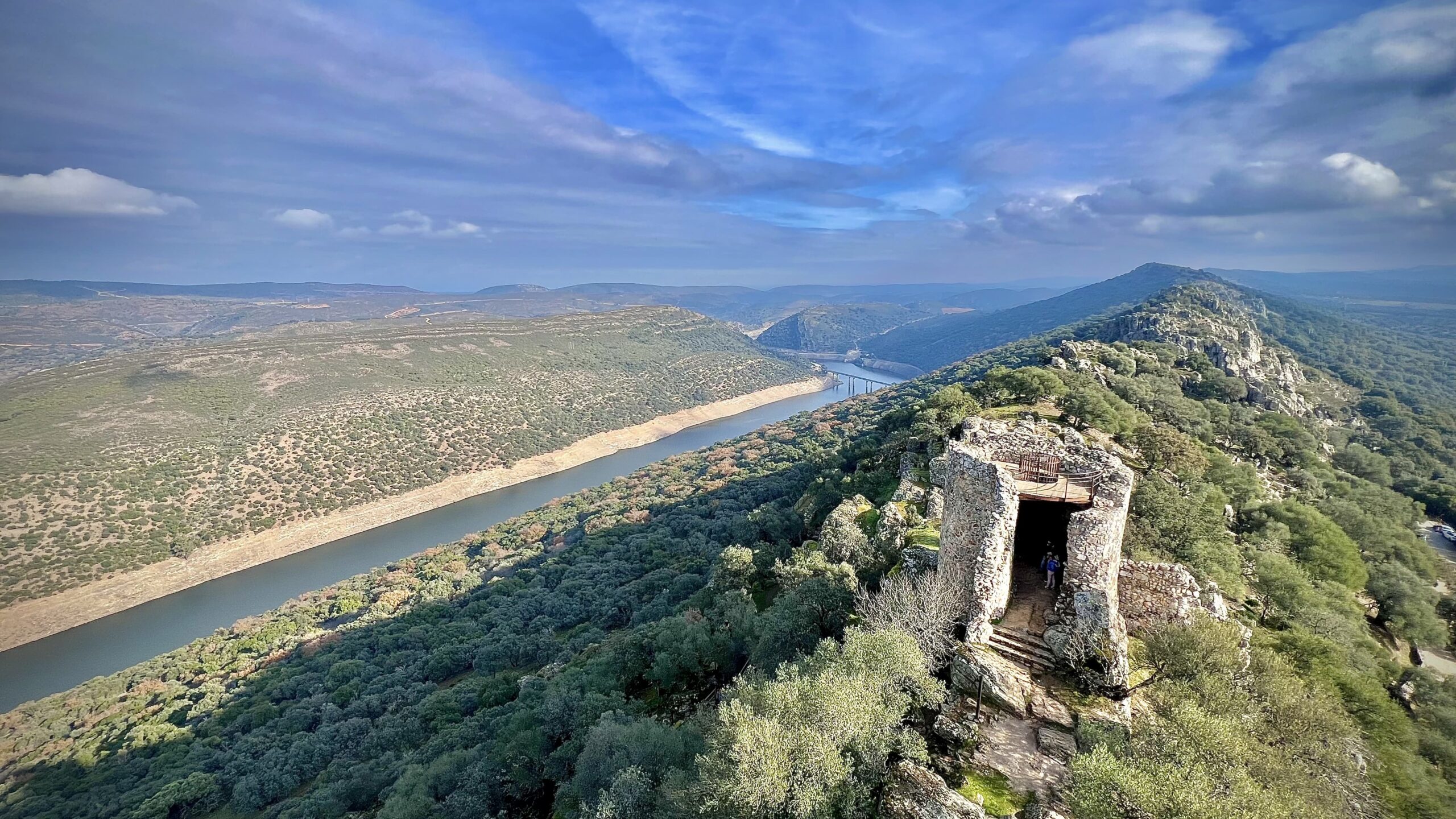 Entrando en Monfragüe ya podemos rebajar la velocidad para disfrutar del paisaje, de las curvas y de los miradores que a lo largo del Parque hay. Podemos parar en cualquiera, bien señalizados para observar la biodiversidad de fauna y flora. Llegaremos pasado el puente de las aguas del Embalse de Jose María Oriol-Alcántara II y la Fuente del Francés al Salto del Gitano. Es el lugar más emblemático y fotografiado del Parque, merece la pena pasar unos minutos allí haciendo fotografías y disfrutando del entorno con sus buitres y su vuelo hipnótico. De allí podemos subir en moto hasta el castillo. Bueno hasta arriba no pero nos quedaremos muy cerca y solo tendremos que subir unos cuantos peldaños hasta la torre. Desde allí las vistas son espectaculares de todo el Parque.